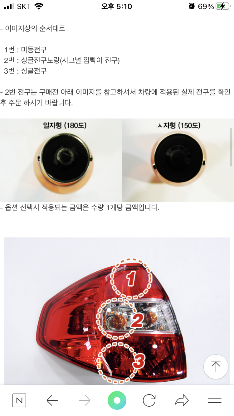중간의 방향지시등 전구 구매시는 아래 설명처럼 일자형(180도)인지, ㅅ자형(150도)인지 확인하고 구매하셔야 합니다.