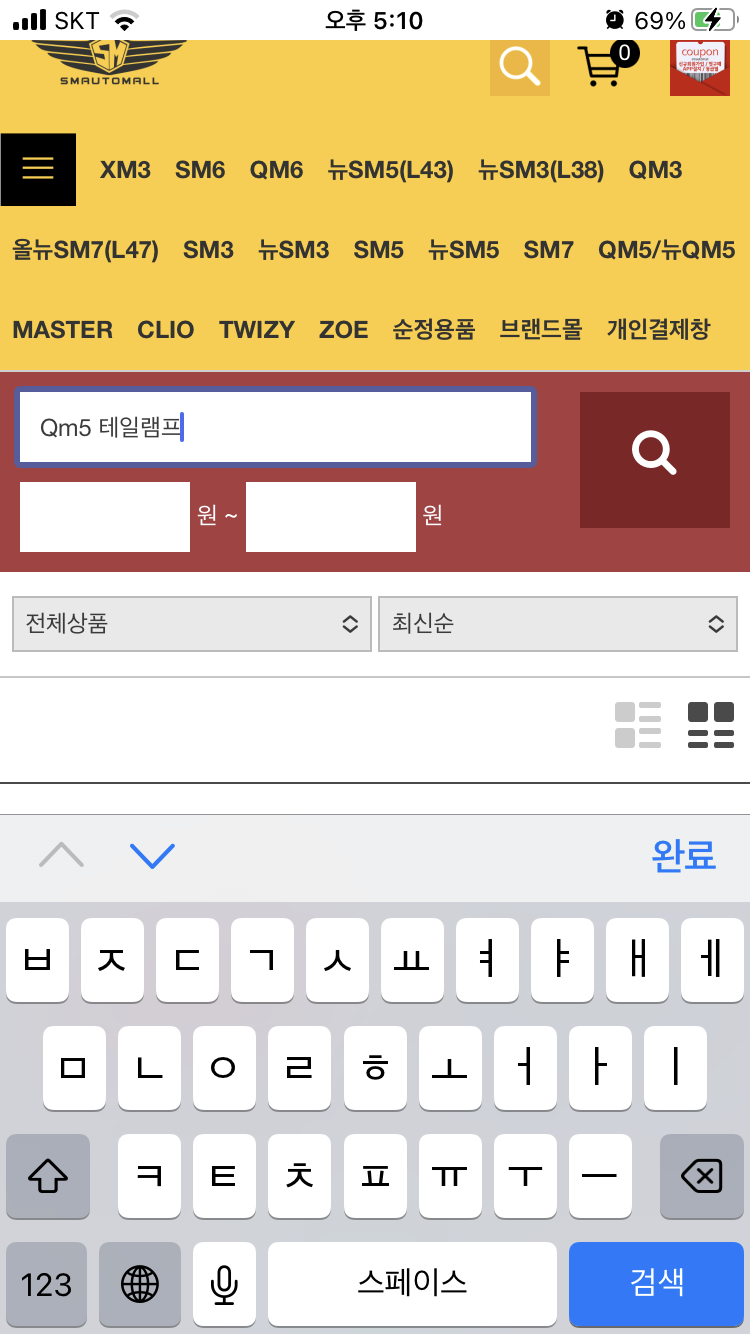 쇼핑몰 검색 창에서 "QM5 테일램프"로 검색합니다.