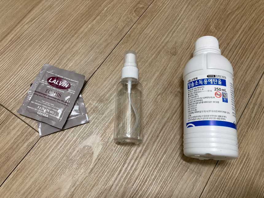 미생물 오염으로 인한 발효 부패를 피하기 위해, 담금주병을 소독용 알코올로 소독해 줍니다.