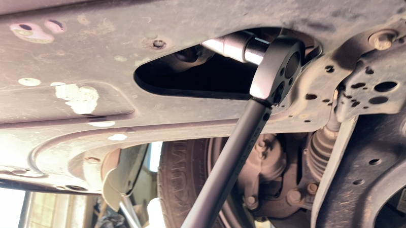 신품 드레인플러그와 신품 와셔를 17mm와 라쳇핸들 1/2인치로 잠가 줍니다.