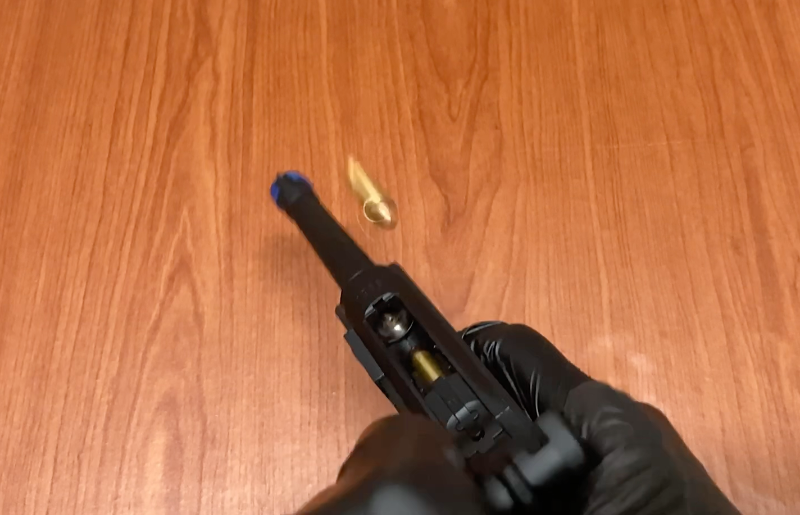 탄창 결합 후 토글을 당겨 후퇴시켜 장전 하고, 방아쇠를 당긴 후 토글을 다시 당겨 후퇴시키면 더미탄이 배출 됩니다.