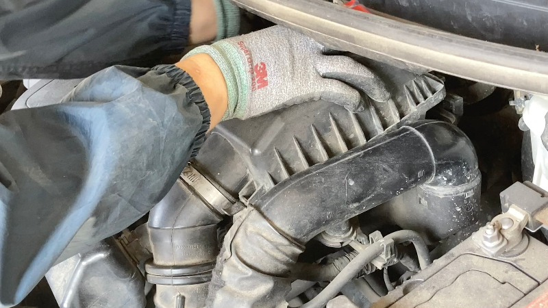 엔진오일 필러 캡을 시계반대 방향으로 돌려 열어 준 후, 원활한 오일 배출과 이물질 유입 방지를 위해 캡은 꽉 잠그지 말고 살짝 닫아 놓습니다.