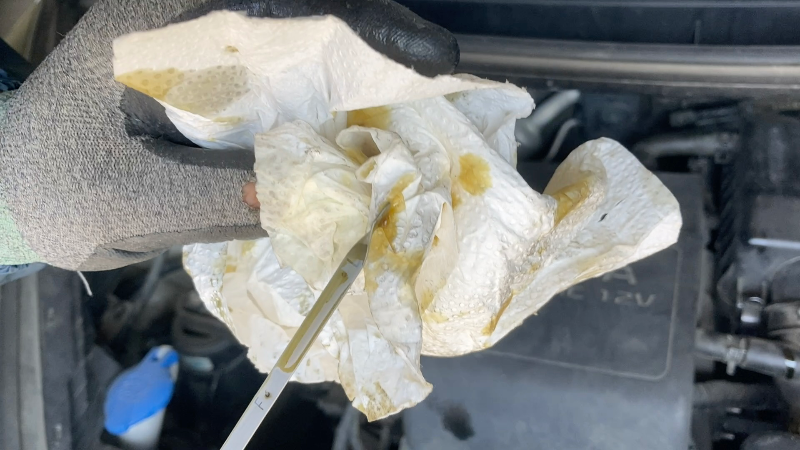 엔진 오일량 게이지를 뽑아서 게이지에 뭍은 오일을 휴지로 닦아주고, 다시 게이지를 꽂은 후 다시 뽑아서 오일 량을 확인 합니다.
