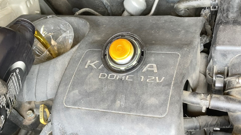 동그란 검은색 뚜껑(엔진오일 필러 캡)을 열어서 엔진오일을 주입합니다.