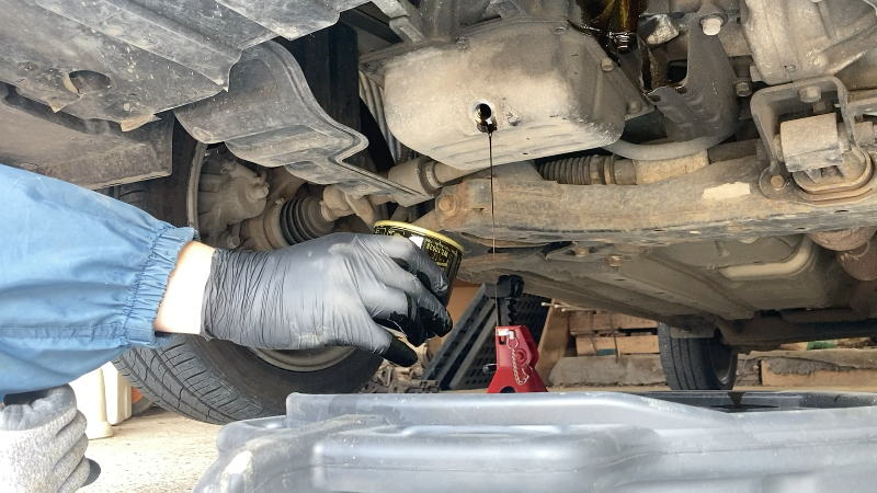 바닥에 폐오일이 잘 나오도록 차량 한쪽을 내려주니 남은 오일이 더 배출 됩니다.