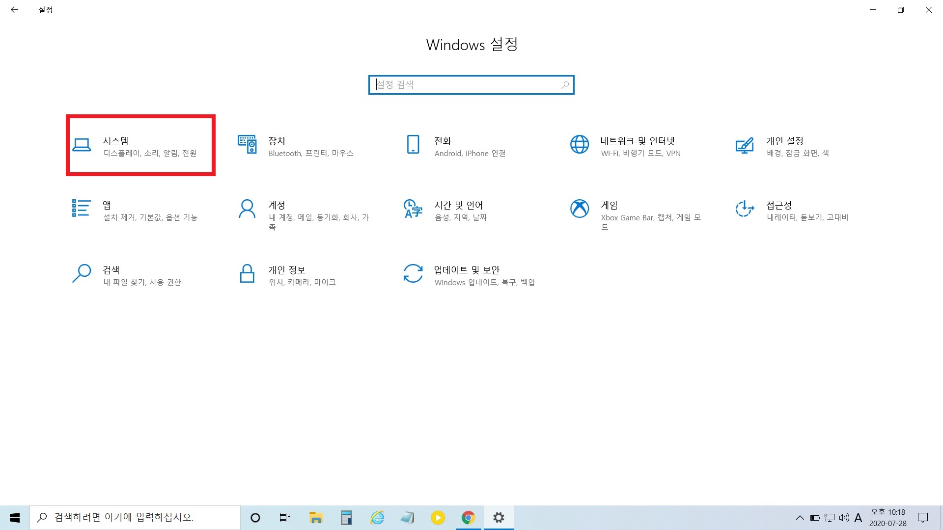 먼저 시작 ->설정으로 들어 가서, 시스템을 클릭 합니다.