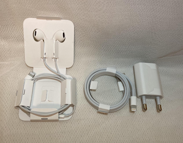 박스를 개봉하면 아이폰 그리고 간단한 설명서(usim 제거하는 핀 포함)와 유선 이어폰, 충전기, 8핀 라이트닝 케이블이 들어 있습니다.