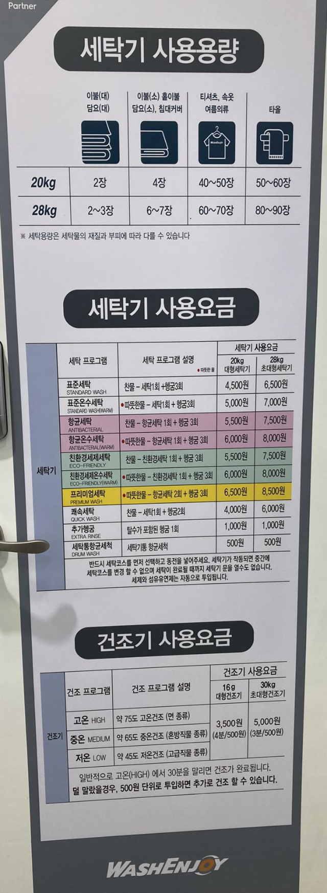 건조기는 세탁기와 다르게 대형건조기16g(4분에 500원) 초대형건조기는30kg(3분에 500원) 입니다.