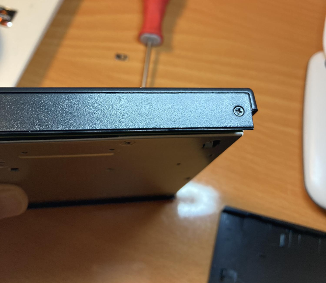cd롬 본체를 연결한 후 케이스 윗부분을 닫은 후 나사를 조여줍니다. 2개의 나사를 조일수 있게 구멍이 뚫어 져있는데 한쪽만 구멍이 맞아서 한쪽만 나사를 조였습니다. 고정되는 데는 한개만 조여도 괜찮을 것 같습니다.