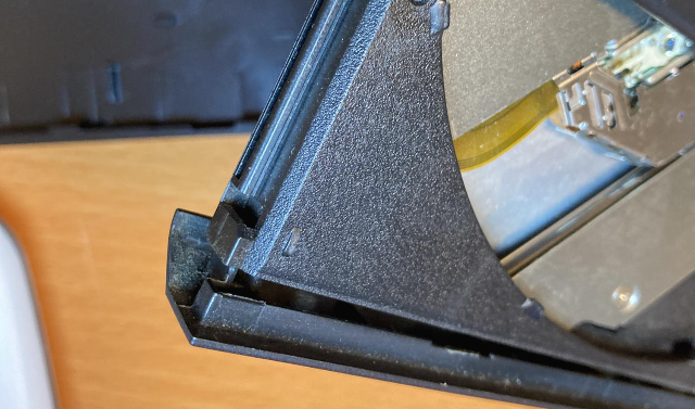 베젤을 분리 하기 위해서는 먼저 cd롬을 open해야 합니다. 작은 구멍을 옷핀같이 얇은 핀으로 찌르면 cd롬이 open 됩니다.