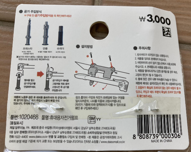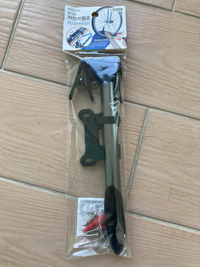 다이소에서 3천원 휴대용 자전거 펌프를 구매했습니다.