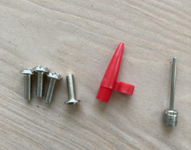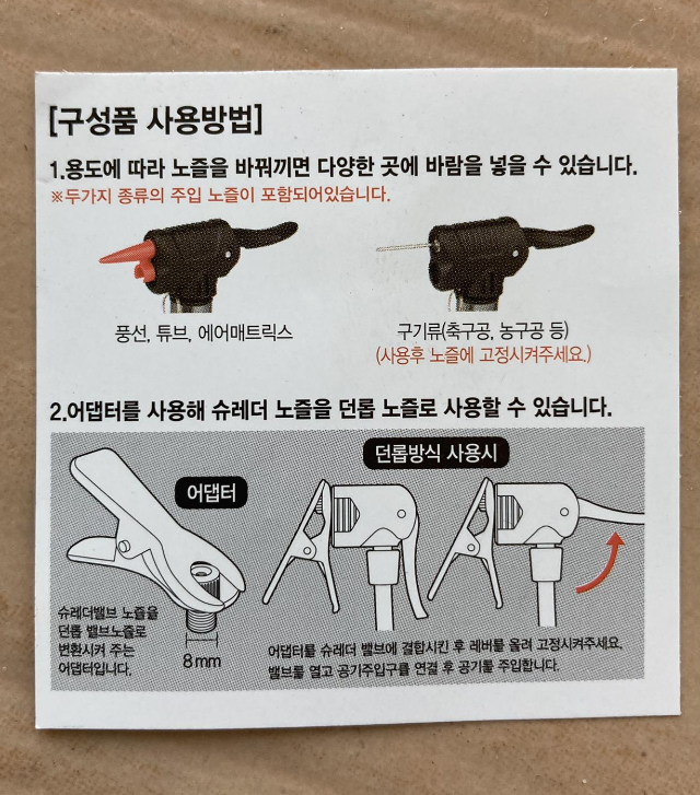 고정용 나사, 풍선 등에 바람 넣을 때 사용하는 노즐, 공에 바람 넣을 때 사용할 노즐이 들어 있습니다.