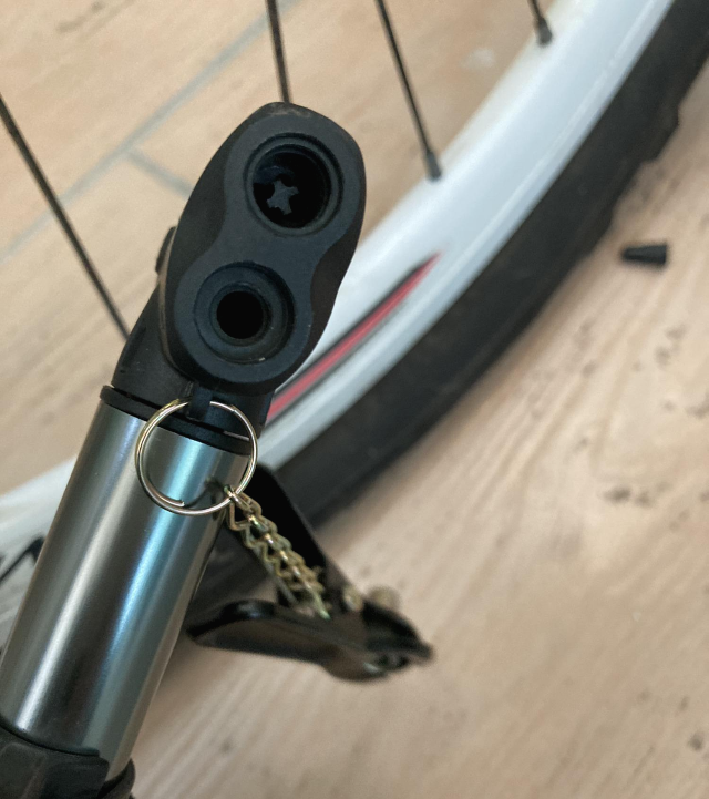 자전거 펌프를 보면 구멍이 두개 있습니다. 아래쪽 구멍을 타이어 공기주입구에 연결해서 공기를 넣으면 됩니다.